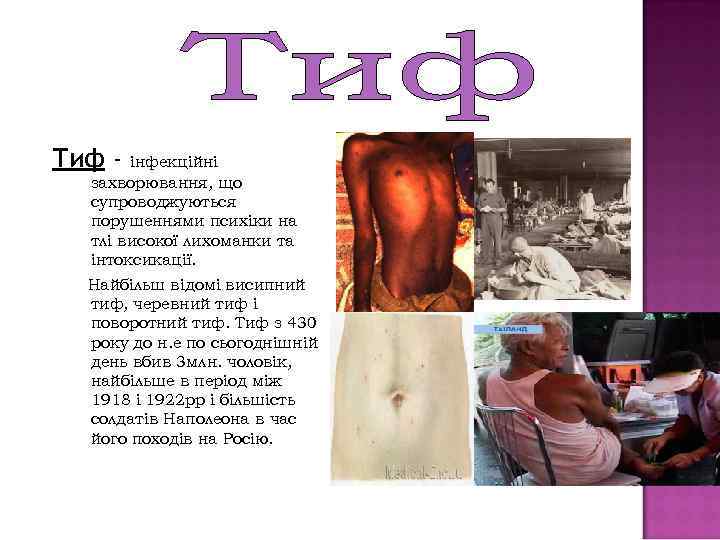 Тиф - інфекційні захворювання, що супроводжуються порушеннями психіки на тлі високої лихоманки та інтоксикації. Найбільш відомі висипний тиф, черевний тиф і поворотний тиф. Тиф з 430 року до н. е по сьогоднішній день вбив 3 млн. чоловік, найбільше в період між 1918 і 1922 рр і більшість солдатів Наполеона в час його походів на Росію.