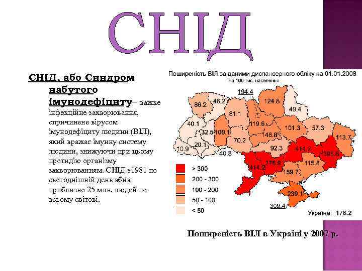 СНІД, або Синдром набутого імунодефіциту — важке інфекційне захворювання, спричинене вірусом імунодефіциту людини (ВІЛ), який вражає імунну систему людини, знижуючи при цьому протидію організму захворюванням. СНІД з 1981 по сьогоднішній день вбив приблизно 25 млн. людей по всьому світові. Поширеність ВІЛ в Україні у 2007 р.