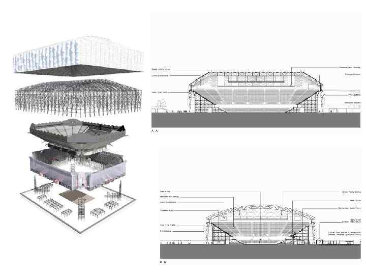 Стадіон Альянц, м. Мюнхен, Німеччина, 2005 р. , швейцарська арх. фірма Херцог і де Мерон, 258 х227 х50 м. Дах утворений металевою консольною фермою 60 м для перекриття зони глядачевих міст. Це найбільша в світі за розмірами оболонка із сополімера етилена і тетрафторетилена, яка складається із 2760 ромбовидних “подушок” різного розміру, які підключені до постійного джерела повітря. 1. Зовнішнє покриття з пластикових повітряних елементів, повітронесомих к-цій. 2. Припіднята кругова рампа, по якій глядачі потрапляють до свої місць. 3. Під рампою знаходяться в’їзди для автомобілів і автобусів команд, поліції, медиків, пожежників, преси. 4. Верхній ярус трибун, 22000 місць для глядачів. 5. Середній ярус, 24000 місць. 6. Нижній сегмент, 20000 місць.