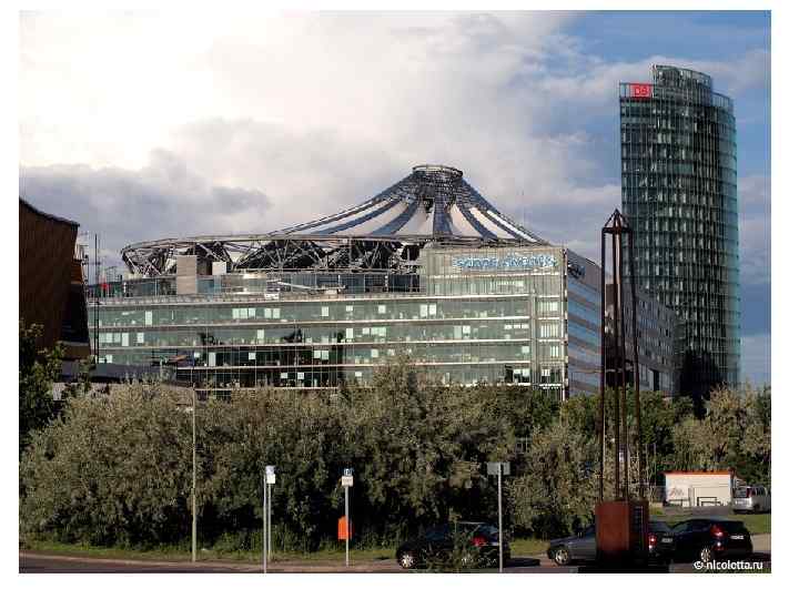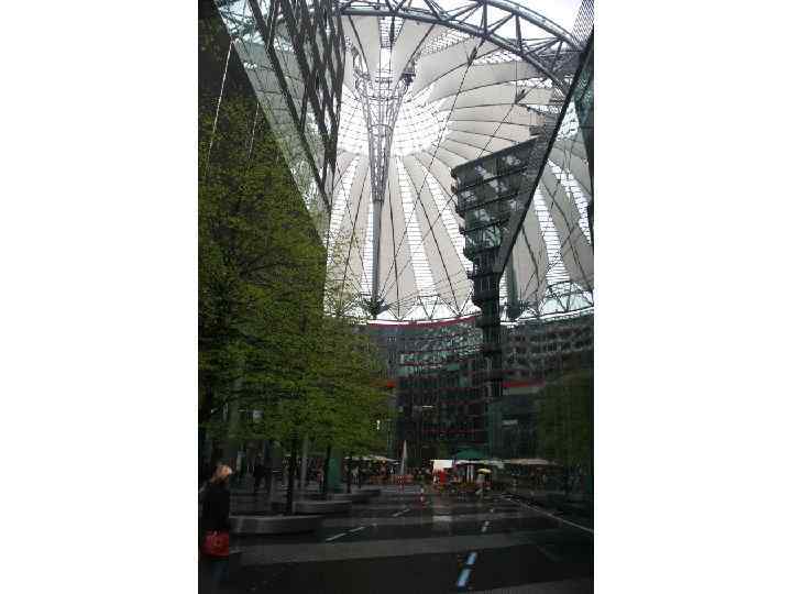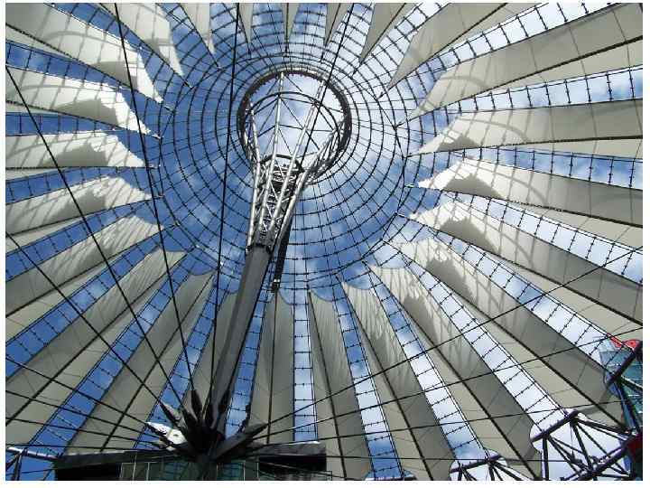 Sony Center, м. Берлін, 2000 р. , арх. Гельмут Ян, складається із семи будівель. Ансамбль із скла і металу включає в себе овальний форум громадського призначення. Конструкція покриття має унікальне конструктивне рішення. Шатрова оболонка закріплена на металевому кільці, який лежить на оточуючих будівлях.