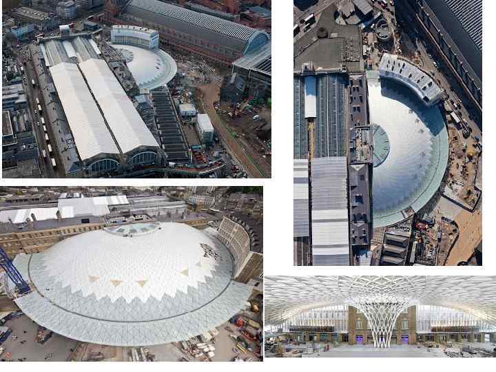 Реінкарнація залізничного вокзалу King’s Cross, м. Лондон, арх. Люнс Кабоіт, 1852 р. Металева оболонка від’ємної гаусової кривини, напівкупол із радіусом 54 м, арх. Джон Мак Аслан, 2012 р.