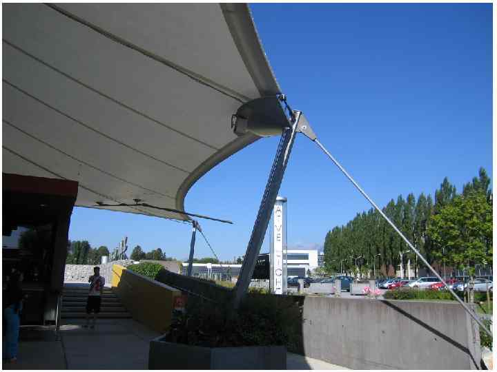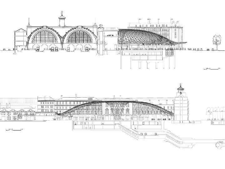 Житній ринок, м. Київ, 1980 р. , арх. В. Г. Штолько – висяча оболонка на розімкнутому опорному контурі • Розміри 104, 8 х 57 м; • Горизонтальну складову розпору гасять: нахилені пілони рамного каркасу, два яруси внутрішніх залізобетонних балконів, металеві відтяжки; • Опорний контур із збірних залізоб. нахилених елементів закріплених до капітелей колон, працює як дві нерозрізні балки; • Ванти із стрижньової арматури 2 D 40 із кроком 2 м, на які спираються залізоб. ребристі плити 2, 6 х1, 75 м; • Перед замонолічуванням швів плити завантажили бетонними блоками для створення попереднього напруження.