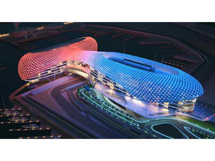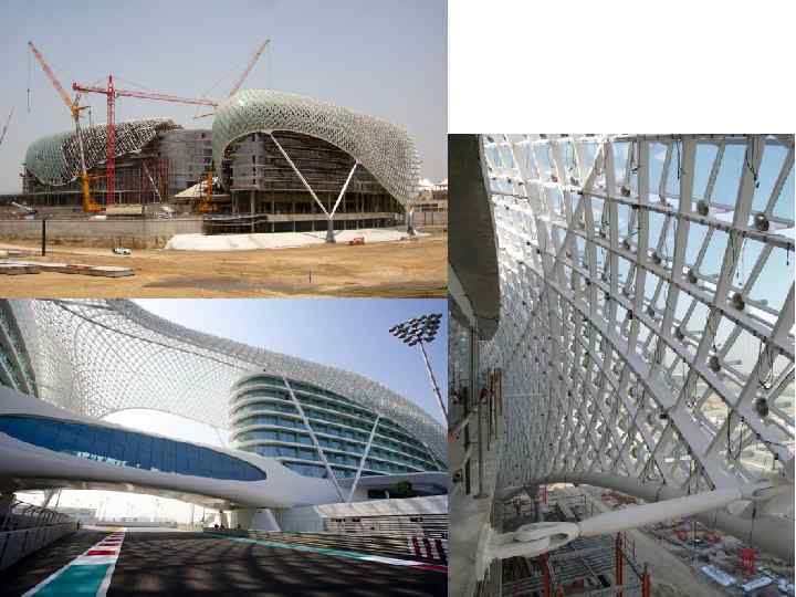 Готель «Yas» , Абу-Дабі, арх. Хані Рашид і Ліз Анн Кутюр із Нью-Йорку, 2009 р. Проект готелю включає гоночну трасу Формули 1, дві будівлі та міст над трасою, які накриті оболонкою від’ємної гаусової кривини