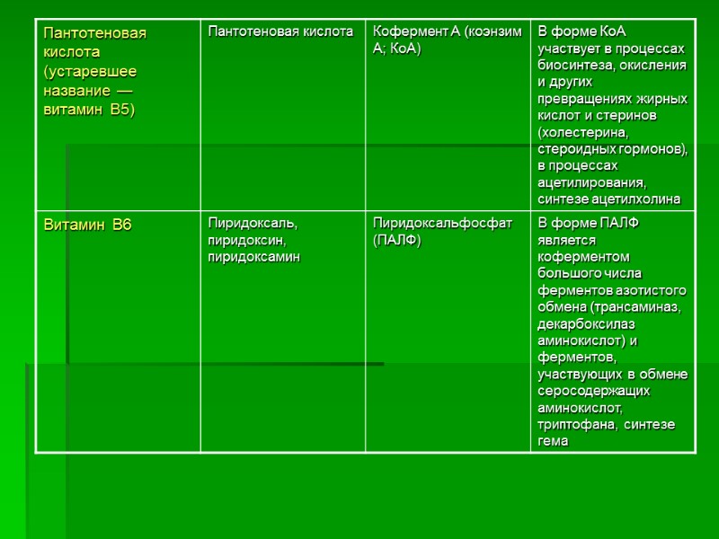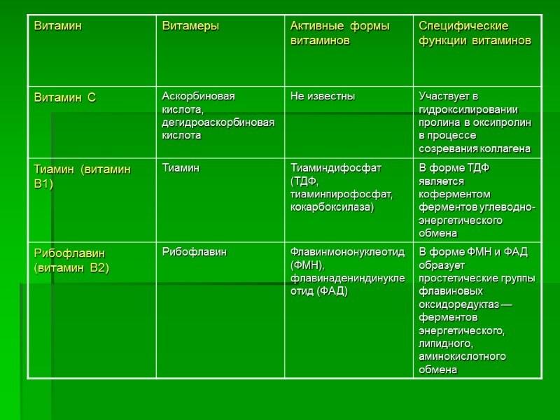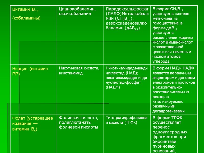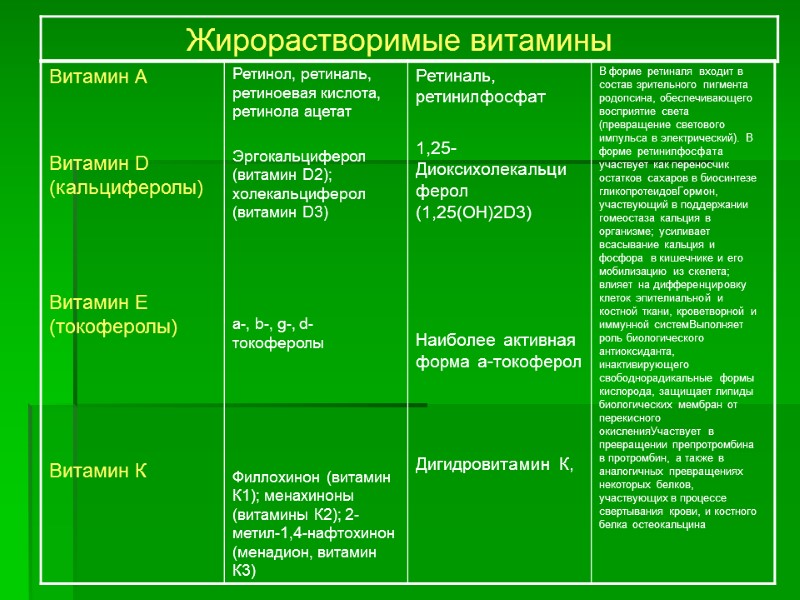 Классификация витаминов Водорастворимые Водорастворимые В включают витамин С и витамины группы В: тиамин, рибофлавин, пантотеновую кислоту, В6, В12, ниацин, фолат и биотин, Жирорастворимыми являются витамины А, Е, D и К. Большинство известных В. представлено не одним, а несколькими соединениями (витамерами), обладающими сходной биологической активностью. Для наименования групп подобных родственных соединений применяют буквенные обозначения; витамеры принято обозначать терминами, отражающими их химическими природу. Примером может служить витамин В6, группа которого включает три витамера: пиридоксин, пиридоксаль и пиридоксамин. Принятая терминология не является общепризнанной, поэтому допускаются разнообразные обозначения В., за исключением устаревших. Жирорастворимые
