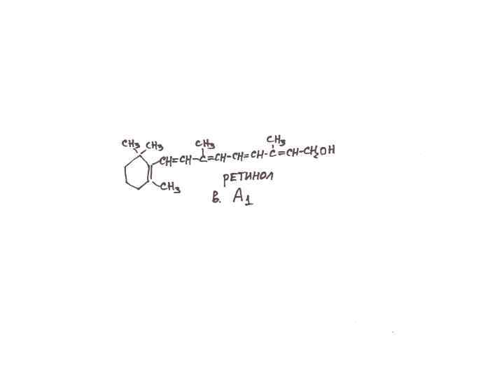 Витамин А (ретинол, антиксерофтальмический) • Циклический непредельный спирт, способный окисляться в ретиналь. • Широко распространен: печень, масло, рыба, овощи, желтки. • Его провитамин – каротин, который распадается на две молекулы витамина. • Без него – задержка роста, кератоз, ксерофтальмия, кератомаляция, поражения кожи.