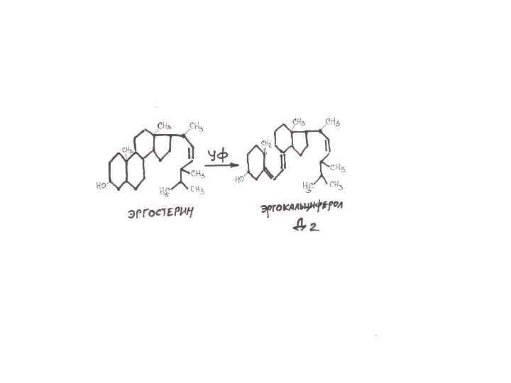 Витамины группы D Активностью обладают D 2 (кальциферол, эргокальциферол). Он получается из провитамина эргостерина, которого много в растительных маслах, дрожжах, молоке, жирах, мясе.