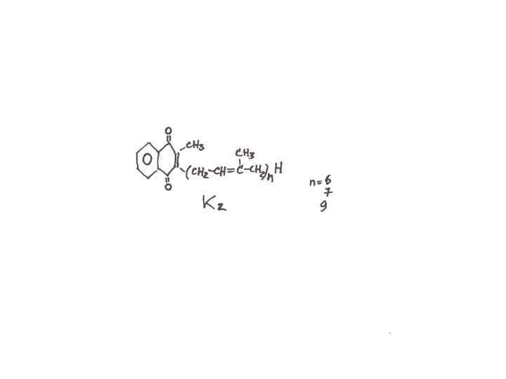 Витамин К (антигеморрагический), менахинон, филахинон • В основе лежит хиноидная структура с модификациями в боковой цепи. • Без него появляются кровоизлияния. • Важен при подготовке к операциям. • Возникает при нарушении всасывания жиров. • Участвует в свертываемости крови. • Есть антивитамин - дикумарин