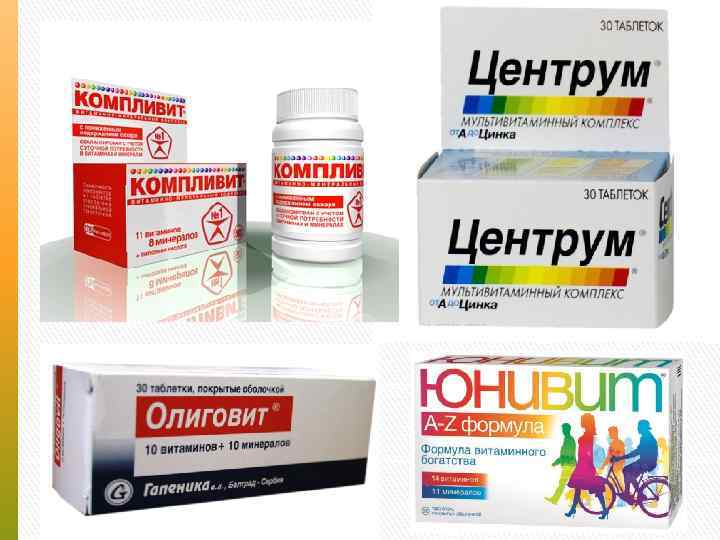 » Существуют моно-, олиго- и поливитаминные препараты: 1. Моновитаминные содержат 1 витамин, например, аскорбиновая кислота 2. Олиговитамины препараты содержат несколько витаминов, например, аскорутин(аскорбиновая кислота +рутин). 3. Поливитаминные препараты содержат целые витаминные комплексы часто вместе с набором микроэлементов. v Обычно принимают по 1 капсуле (таблетке) в день после еды курсами от 1 до 6 месяцев. v Наиболее распространенные и хорошие крмплексные витамины «Центрум» , «Компливит» , «Юникап» , «Олиговит» .