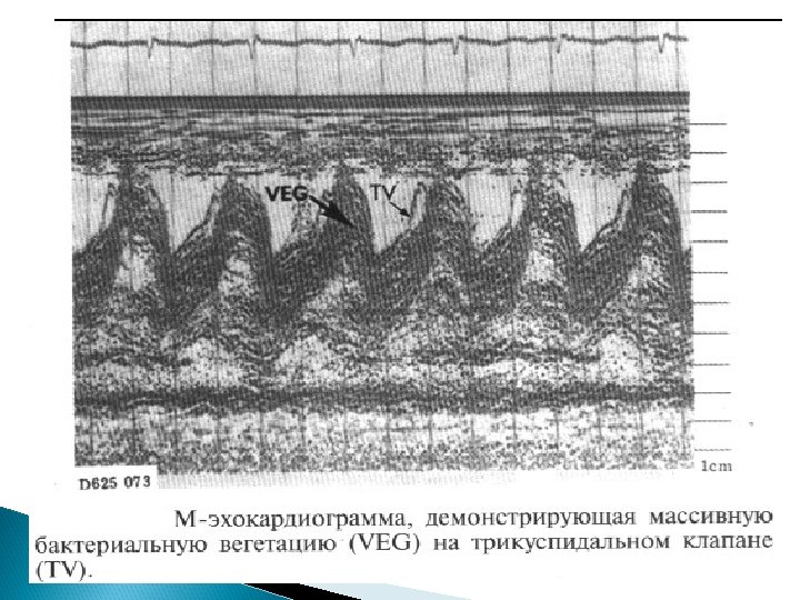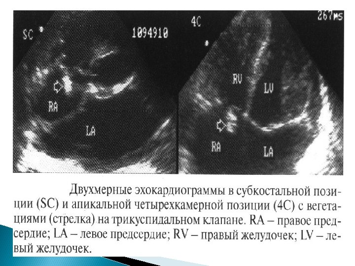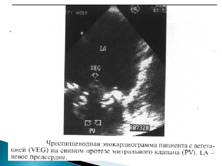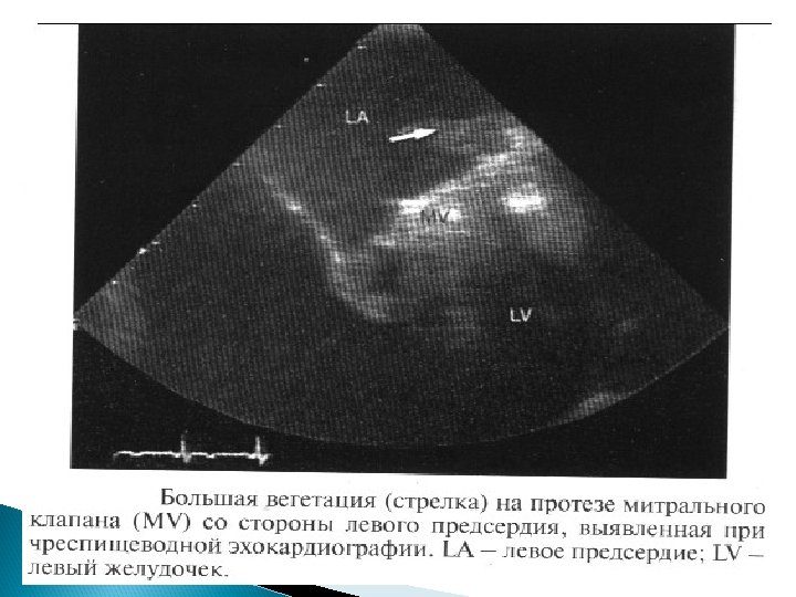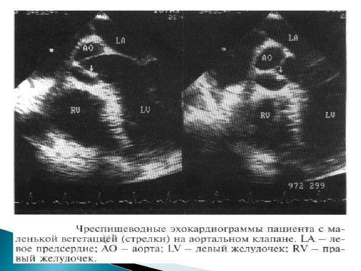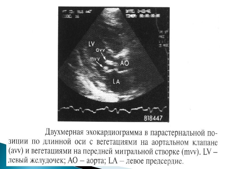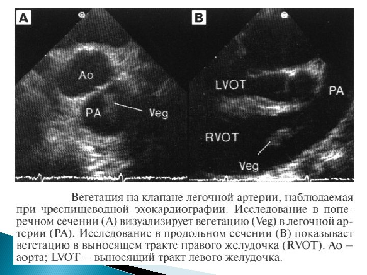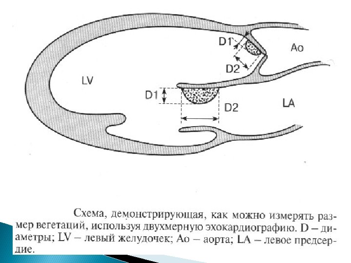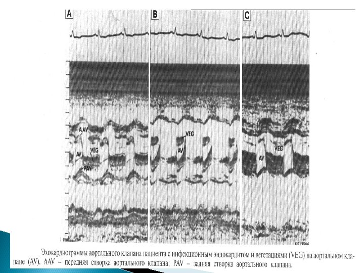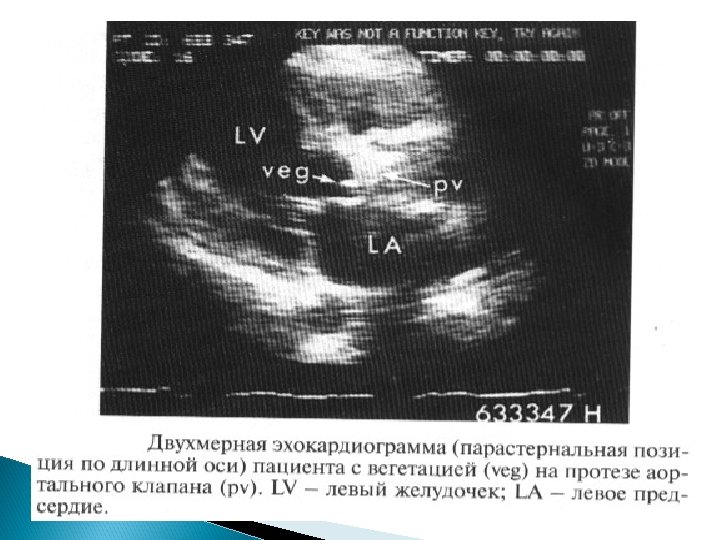 Основные Эхо. КГ-критерии диагноза ИЭ: a) мобильная, эхо-плотная масса, прикрепленная к эндокарду клапана или стенки, или имплантированная в материал протеза; b) наличие абсцессов или фистул; c) новый тип движения протеза клапана при раскрытии, особенно в позднем периоде после имплантации.