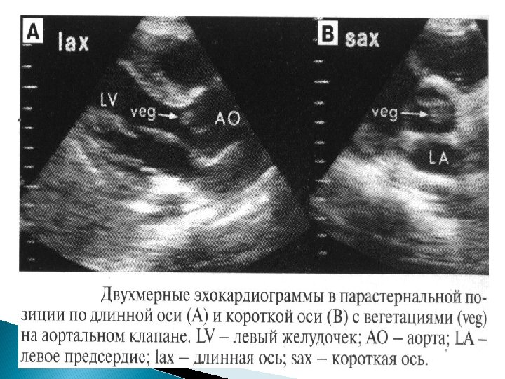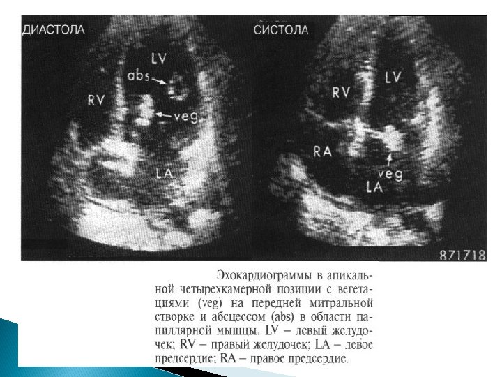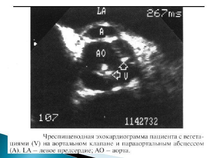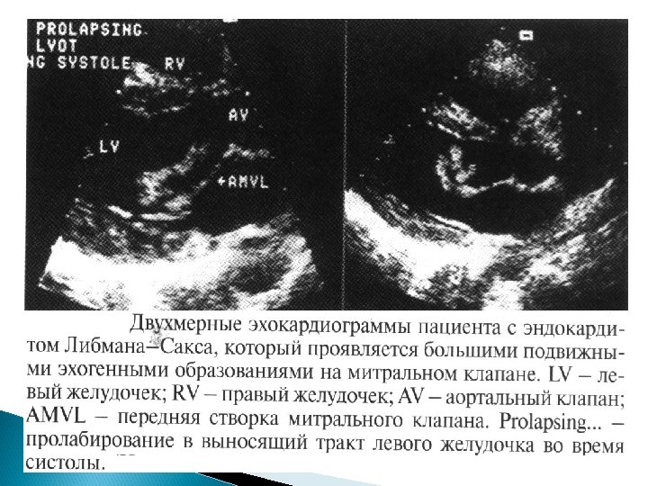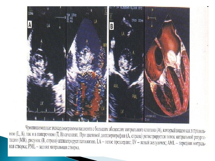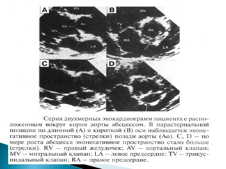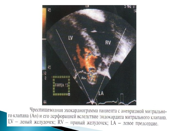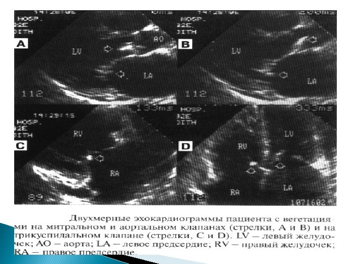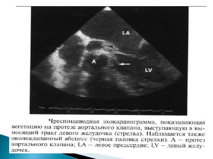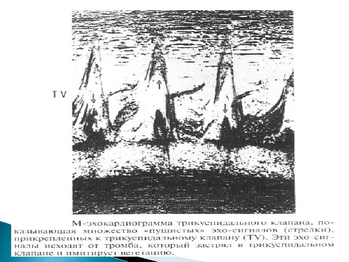 Основные Эхо. КГ-критерии диагноза ИЭ: a) мобильная, эхо-плотная масса, прикрепленная к эндокарду клапана или стенки, или имплантированная в материал протеза; b) наличие абсцессов или фистул; c) новый тип движения протеза клапана при раскрытии, особенно в позднем периоде после имплантации.