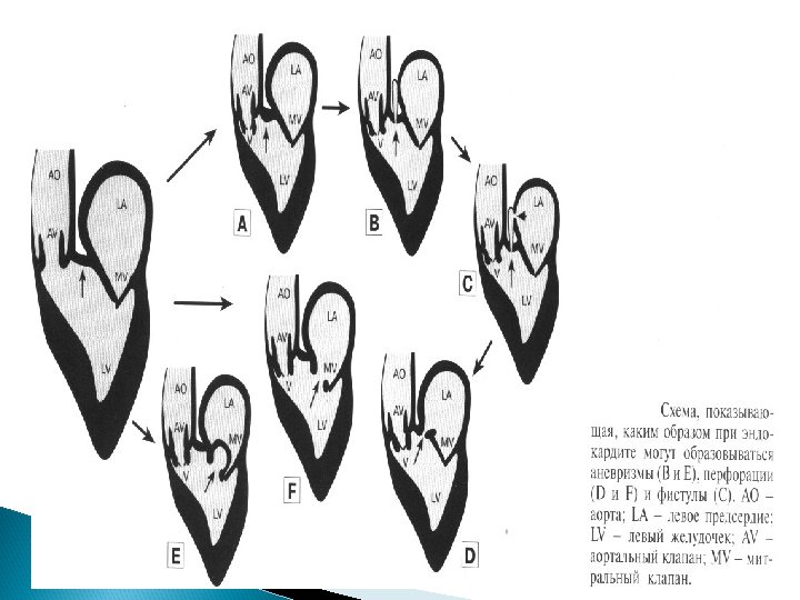 Классификация бактериальных эндокардитов, осложняющих врожденные пороки сердца Стадия Форма Характер течения Клинически Морфологически I - начальная Мукоидный отек эндокарда Типичная Острое, подострое, рецидивирующее Активная II микросимптомов Бородавчатый эндокардит Стертая Хроническое Неактивная III – септических проявлений Тромбоязвенный эндокардит Атипичная Латентное