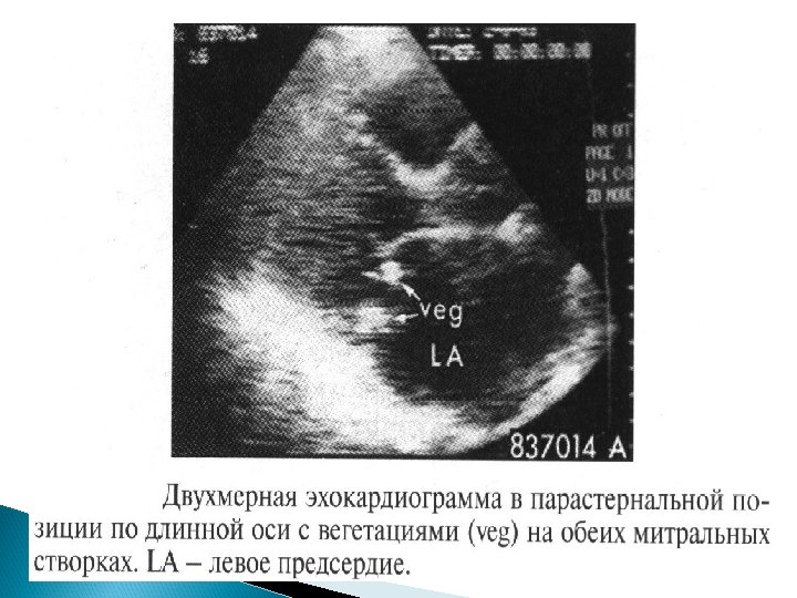КЛИНИЧЕСКИЕ КРИТЕРИИ ИНФЕКЦИОННОГО ЭНДОКАРДИТА (2) (по D. Durack et al. , 1994) МАЛЫЕ КРИТЕРИИ 1. Предрасположенность (кардиогенные факторы или частые внутривенные инъекции лекарств, в том числе при наркомании). 2. 3. Температура тела 380 С и выше. Сосудистые феномены (эмболии крупных артерий, инфаркт легкого, микотические аневризмы, внутричерепные кровоизлияния, пятна Джэнуэя). 4. Иммунологические феномены (гломерулонефрит, узелки Ослера, пятна Рота, ревматоидный фактор+серозит, миокардит, гепатит, васкулит). 5. Микробиологические данные (положительная гемокультура, не удовлетворяющая большому критерию, т. е. Однократная позитивная культура нетипичных для ИЭ возбудителей, или серологическое подтверждение активной инфекции, обусловленной потенциальным возбудителем ИЭ). 6. 7. ЭХО-КГ данные, согласующиеся с ИЭ, но не отвечающие большому критерию (утолщение клапанных створок, «стертые» вегетации и т. д. ). Изменения лабораторных показателей (анемия, сдвиг влево лейкоцитарной формулы, тромбоцитопения, резкое увеличение СОЭ, СРБ, гипопротеинемия, гиперфибрногенемия, криоглобулинемия, положительный ревматоидный фактор, высокий уровень ЦИК, АНФ в низких титрах, протеинурия, гематурия)