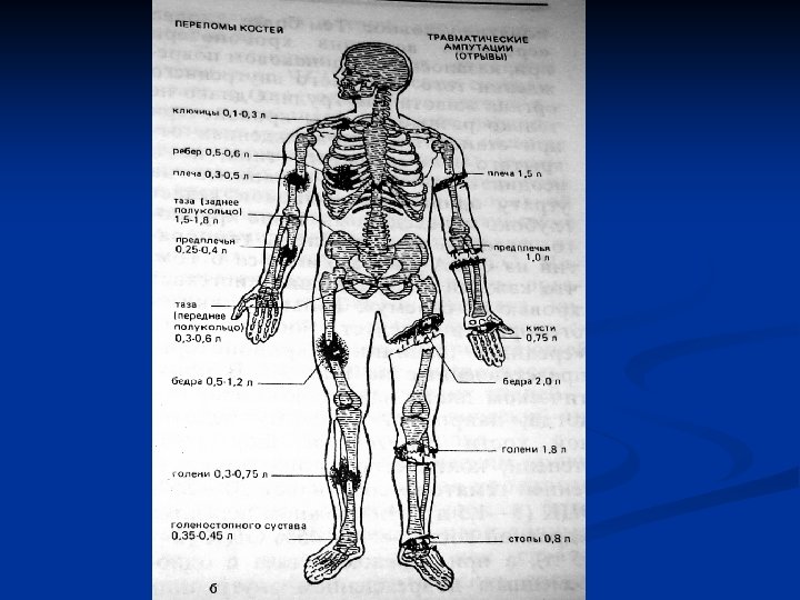 ОПРЕДЕЛЕНИЕ СТЕПЕНИ КРОВОПОТЕРИ по Ван – Слайку – Барашкову Относительная плотность крови Гемоглобин г/л Гематокрит АД Частота пульса Кровопотеря мл 1, 057 -1, 054 65 -62 0, 44 -0, 40 Норма До 500 1, 053 -1, 050 61 -50 0, 38 -0, 32 Нерезко понижено Учащенный 500 -1000 1, 049 -1, 044 53 -38 0, 30 -0, 22 Пониженное То же 1000 -1500 1, 044 и ниже Ниже 38 Ниже 0, 22 Низкое Нитевидный Более 1500