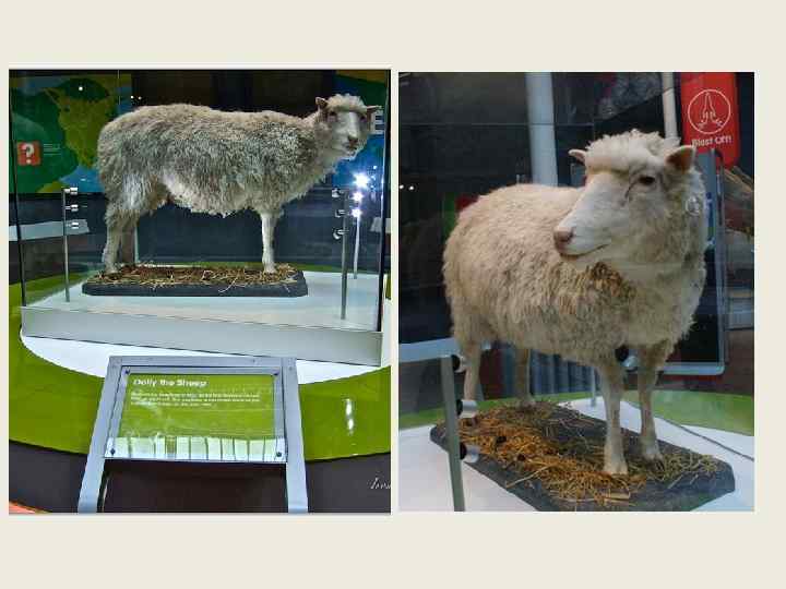 ЕКСПЕРЕМЕНТ У х од і експерименту одна із сом атич них клітин вже померлої до т ого ч асу вівці послужи ла джер ело м ген етичного матеріалу , я кий був з'єднаний з статевої клітино ю іншої вівці. Власний генетич ний матеріал з останньої бу в повн істю вилучений. Сфор мо вана таким чином яйцеклітина , що міст ить генетич ний матеріал тільк и перші вівц і , була виношу вівцею су ро га тно ю матір'ю. У результаті н арод илося ягня , що ст ав від ом им як Доллі. І була доведена мо жливість клонування те плокр овних тварин , включаючи і вже по мерлих , якщо в ід них залишивс я необхідний генетичний матеріал.