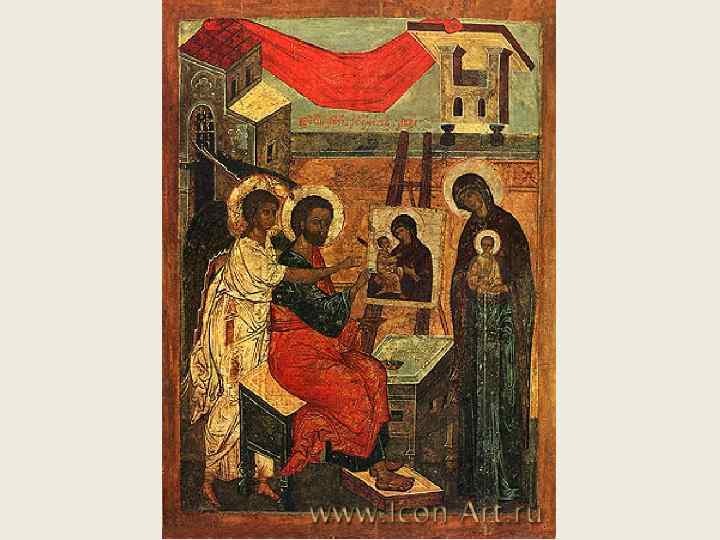 Создание первых икон Божией Матери по преданию относит к апостольским временам и связывают с именем евангелиста Луки. Евангелист Лука пишет икону Богоматери (Михаил Дамаскин XVI век)