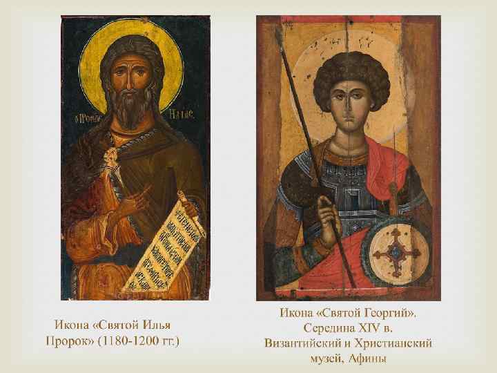 Икона «Святой Георгий Каппадокийский со сценами жития» (XIII в. ) На иконе в рост показан молящийся святой Георгий, который обращается к Христу, как бы слетающему с небес в правом верхнем углу средника этой иконы. На полях – подробный житийный цикл. Над образом показаны два архангела, которые фланкируют не сохранившийся образ «Престола Уготованного (Этимасии)» . В этой иконе, как и на многих других иконах середины XIII века, видны определенные западные черты. В эту эпоху основная часть Византийской империи занята крестоносцами. Можно предположить, что заказчица иконы могла быть связана с этой средой. Об этом говорит очень не византийский, не греческий щит Георгия, который весьма напоминает щиты с гербами западных рыцарей. По краям щит окружает своеобразный орнамент, в котором легко узнать имитацию арабского куфического письма, в эту эпоху оно было особенно популярно и считалось знаком сакрального.