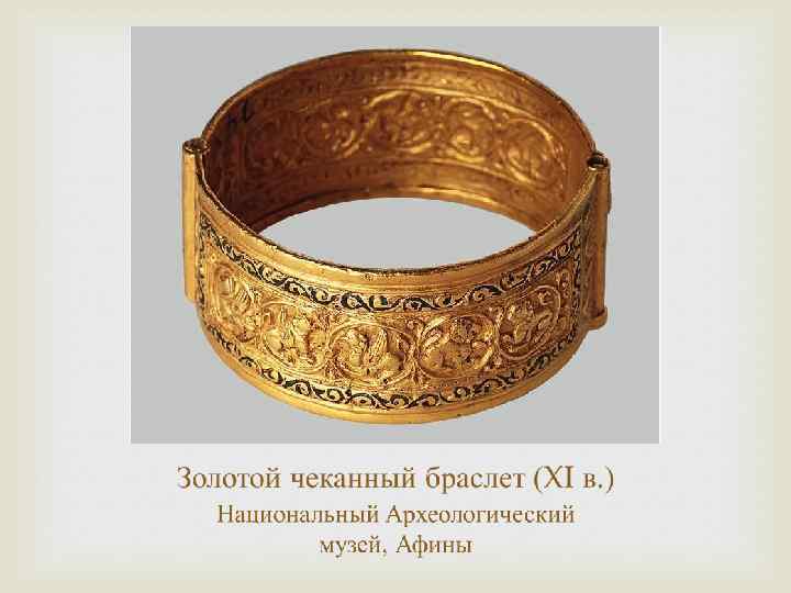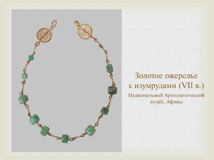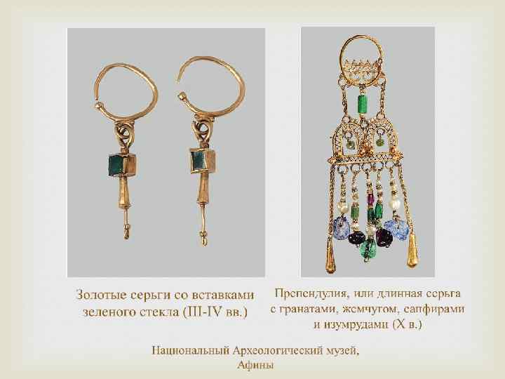 Ювелирные украшения Несмотря на проповедуемые церковью скромность и простоту, любовь женщин к ювелирным украшениям не угасала. Даже приняв христианство, многие женщины не смогли отказаться от привычки надевать ослепительные драгоценности. Годы борьбы христианских проповедников за простоту и скромность разбивались об непреодолимое желание женщин выглядеть привлекательнее. Ткани и ювелирные украшения были неотъемлемой частью женского существования. Женские ювелирные украшения играли важную роль в византийском обществе. Они должны были не только услаждать взор и подчеркивать красоту девушки, но и показать достаток и статус семьи в обществе.