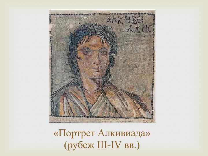 Мозаики «Персонификация Солнца» и «Портрет Алкивиада» Искусство изготовления красивых мозаичных полов было широко востребовано в Византии. «Персонификация Солнца» и «Портрет Алкивиада» являются частями большого мозаичного пола. Композиция включала фигуры девяти муз, персонификации дня, ночи, солнца, луны и пять портретов знаменитых поэтов. Портрет Алкивиада является одним из самых выразительных в этой серии.