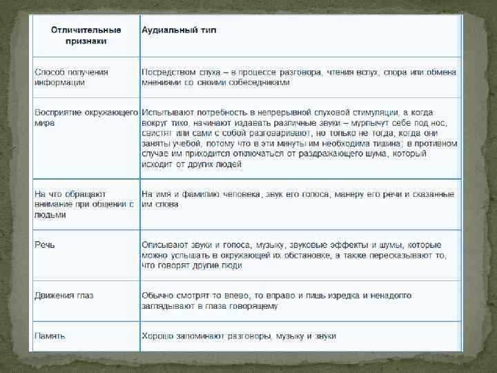 АУДИАЛЫ - те, кто в основном получает информацию через слуховой канал. От них можно требовать немедленного повторения услышанного им материала. При выполнении работы на уроке или дома аудиалу рекомендуется не делать замечания, когда он в процессе запоминания издает звуки, шевелит губами - так ему легче справиться с заданием.