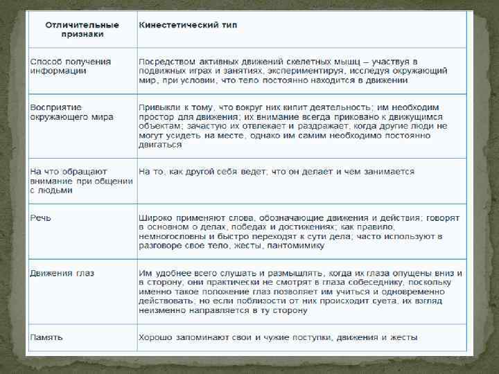 КИНЕСТЕТИКИ - люди, воспринимающие большую часть информации через другие ощущения (обоняние, осязание и др. ) и с помощью движений. От них лучше не ждать ни того, ни другого - они нуждаются в другом отношении, им нужно больше времени и терпения со стороны учителей и домашних. При выполнении работы на уроке или дома кинестетика рекомендуется не заставлять сидеть долгое время неподвижно; обязательно давать ему возможность моторной разрядки (сходить за мелом, писать на доске, дома - сходить в другую комнату и т. д. ); запоминание материала у него легче происходит во время движения.