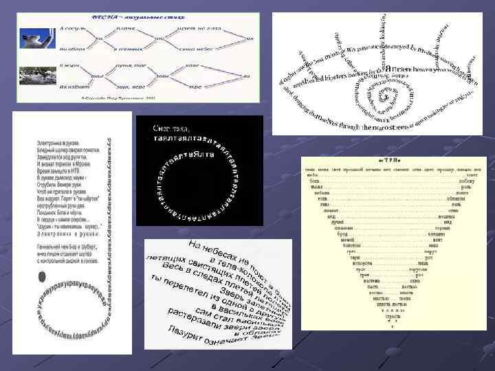 Форма, образующая сущность слова В визуальной поэзии авторы пытаются, ломая стиховые традиции, добиться совершенства произведения, выжать самую сущность слова или перешагнуть “за рамки” поэзии и создать нечто большее, чем вербальный текст. Визуальная поэзия – это прежде всего эксперимент с формой.