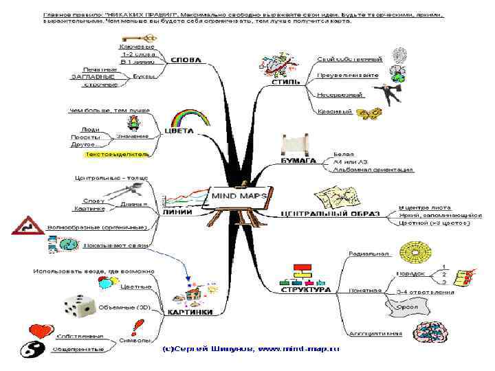 Законы построения интеллект-карт Законы содержания, оформления и структуры Везде, где возможно, добавляем рисунки, символы, и другую графику, ассоциирующиеся с ключевыми словами.