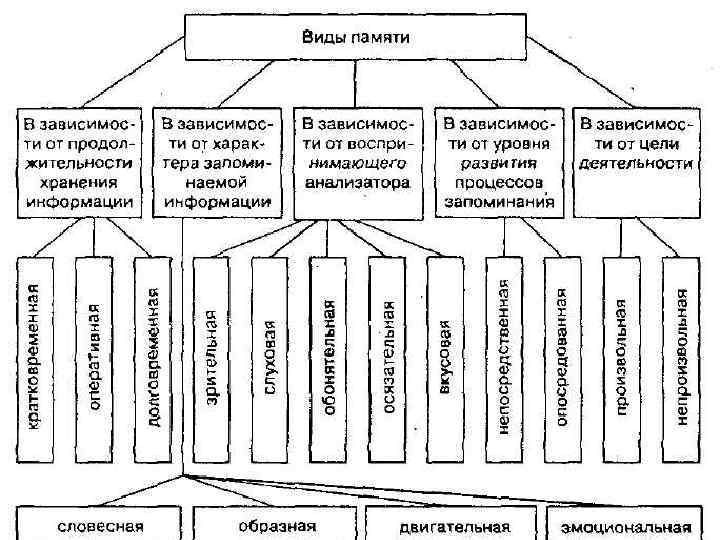 Классификация памяти По органам чувств: зрению, слуху, обонянию, осязанию и вкусу. Соответственно выделяют: зрительную, слуховую, обонятельную, осязательную и вкусовую память. По характеру запоминаемой информации можно выделить: память на слова (вербальная память), память на образы (образная), память на движение (моторная), память на эмоции, чувства, переживания (эмоциональная), а также память на расположение предметов в пространстве, на временные отрезки, на числа, фамилии, лица и т. д. По критерию развитости процессов запоминания на непосредственную и опосредованную.