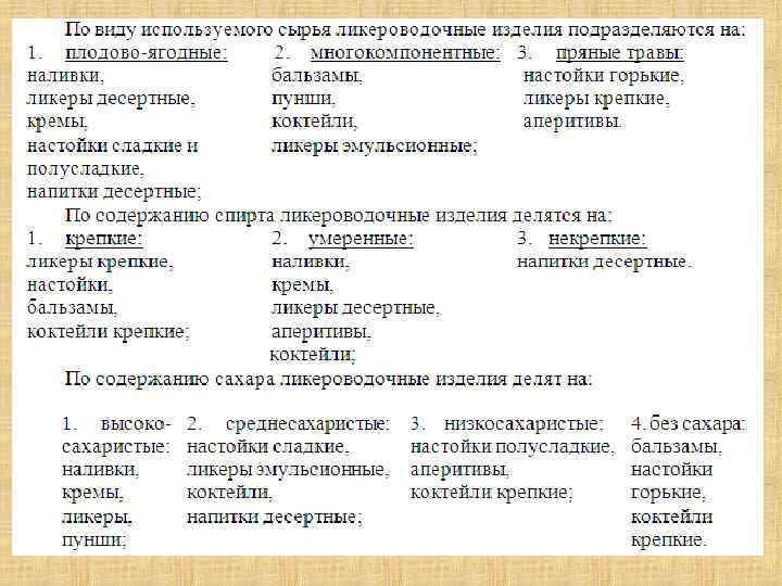 В торговле чаще всего используется деление ликероводочных изделий по назначению. Группы и подгруппы этих изделий различаются составом. Содержание Группа Сахар, г/дм 3 Спирт, % об Ликеры крепкие 30 -45 32 -50 десертные 25 -30 35 -50 кремы 20 -23 50 -60 Наливки 18 -20 25 -50 Настойки сладкие 16 -25 16 -30 полусладкие 30 -40 2 -10 горькие 25 -45 бальзамы 40 -45 джин До 45 Пунши 16 -17 32 -40 Аперитивы 15 -45 7 -30 Коктейли 20 -40 0 -24