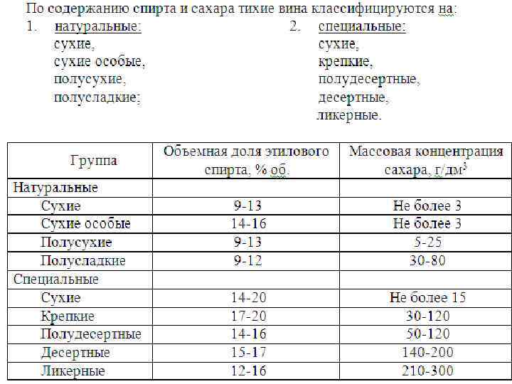 По цвету вина могут быть белыми, розовыми, красными. Также виноградные вина делятся на сортовые (произведены из 1 сорта винограда) и купажные (произведенные из разных сортов винограда). В зависимости от качества и сроков выдержки тихие вина делятся на молодые, вина без выдержки, выдержанные, марочные, коллекционные. Началом срока выдержки считается первое января следующего за урожаем винограда года. Выдержанное вино – это вино улучшенного качества, полученное по специальной технологии с обязательной выдержкой перед разливом в бутылки не менее 6 месяцев. Марочные – это высококачественные вина, вырабатываемые из лучших сортов винограда в отдельных районах по специальной технологии и выдержанные перед разливом в бутылки не менее 1, 5 года. Коллекционные – это марочные вина высокого качества, дополнительно выдержанные не менее 3 лет в бутылках.