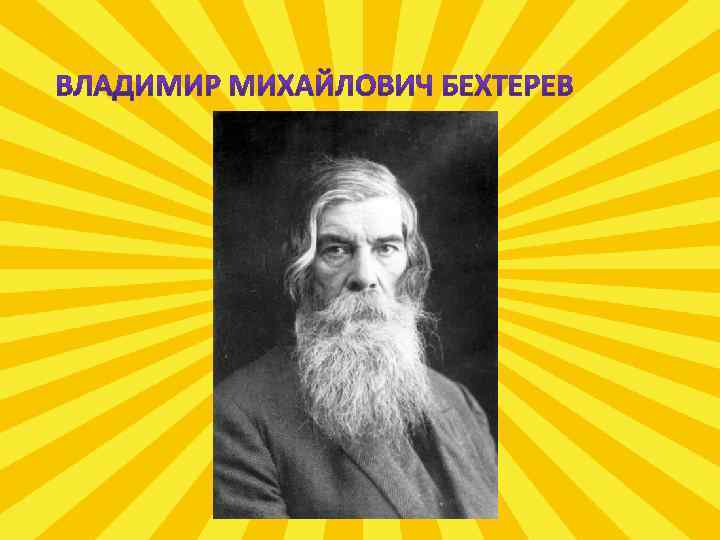 Влади мир Миха йлович Бе хтерев родился 20 января 1857 в Сорали, умер 24 декабря 1927, в Москве. Выдающийся русский медикпсихиатр, невропатолог, физиолог, психолог, основоположник рефлексологии и патопсихологического направления в России, академик. Исследовал личность на основе комплексного изучения мозга физиологическими, анатомическими и психологическими методами. Основатель рефлексологии. Теория В. М. Бехтерева представляет собой попытку реализовать рефлекторный принцип в понимании психических явлений.