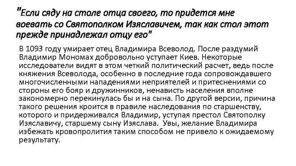 "Если сяду на столе отца своего, то придется мне воевать со Святополком Изяславичем, так как стол этот прежде принадлежал отцу его" В 1093 году умирает отец Владимира Всеволод. После раздумий Владимир Мономах добровольно уступает Киев. Некоторые исследователи видят в этом четкий политический расчет, ведь после княжения Всеволода, особенно в последние года сопровождавшего многочисленными нападениями неприятелей и притеснениями со стороны его бояр и дружинников, ненависть населения вполне закономерно перекинулась бы и на сына. По другой версии, причина такого решения кроится в правиле наследования по старшенству, которого и придерживался Владимир, уступая престол Святополку Изяславичу, старшему сыну Изяслава. Увы, желание Владимира избежать кровопролития таким способом не привело к ожидаемому результату.