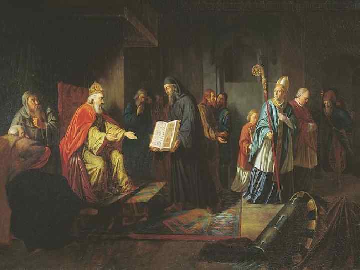 Выбор веры • Согласно преданию, летом 986 года к княжескому двору явились представители четырех вер: ислама, католицизма, иудаизма и православия. Первым взял слово представитель «магометанской веры» (ислама). «И спросил Владимир: „Какова же вера ваша? " Они же ответили: „Веруем богу, и учит нас Магомет так: не есть свинины, не пить вина • и сказал Владимир: „Руси есть веселие пить, не можем без того быть"» .