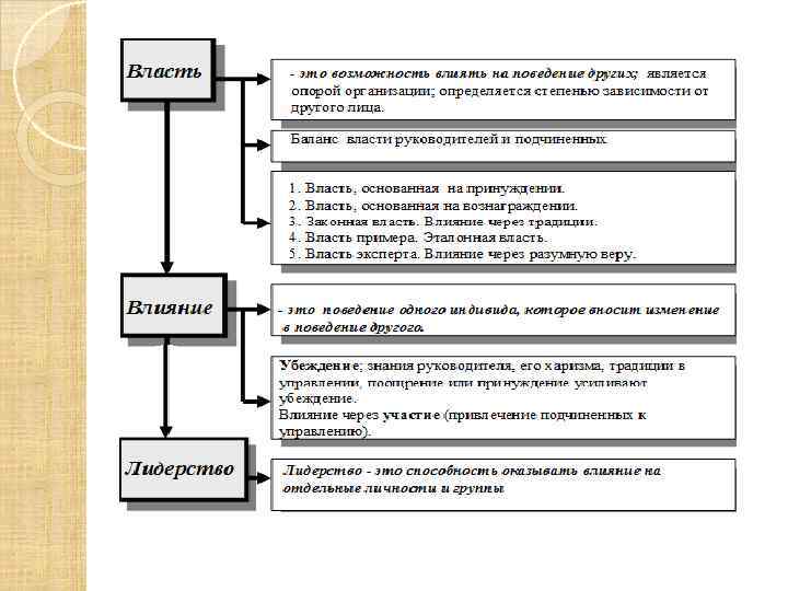 Власть — означает способность (возможность) влиять на поведение других людей, с целью подчинить их своей воле. Лидерство – это умение так организовать взаимодействие с людьми, чтобы каждый из них искренне захотел достичь поставленной лидером цели.