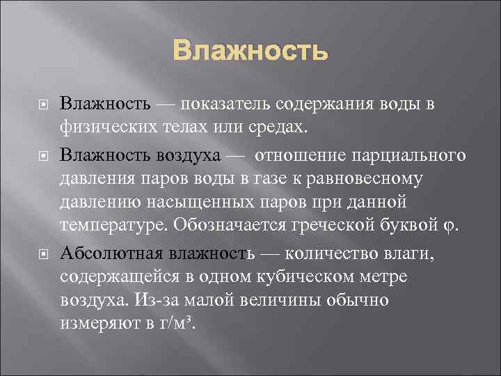 Влажность Влажность — показатель содержания воды в физических телах или средах. Влажность воздуха — отношение парциального давления паров воды в газе к равновесному давлению насыщенных паров при данной температуре. Обозначается греческой буквой φ. Абсолютная влажность — количество влаги, содержащейся в одном кубическом метре воздуха. Из-за малой величины обычно измеряют в г/м³.
