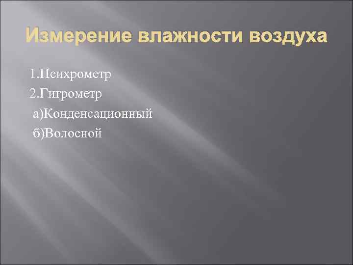 Измерение влажности воздуха 1. Психрометр 2. Гигрометр а)Конденсационный б)Волосной