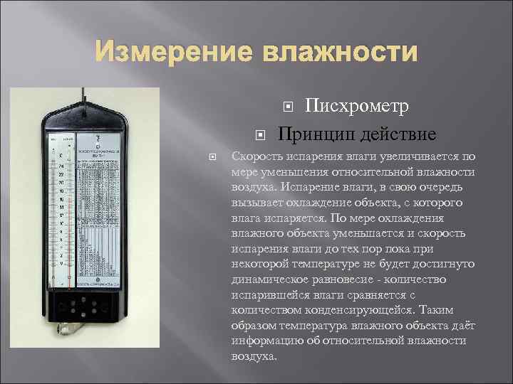 Измерение влажности Писхрометр Принцип действие Скорость испарения влаги увеличивается по мере уменьшения относительной влажности воздуха. Испарение влаги, в свою очередь вызывает охлаждение объекта, с которого влага испаряется. По мере охлаждения влажного объекта уменьшается и скорость испарения влаги до тех пор пока при некоторой температуре не будет достигнуто динамическое равновесие - количество испарившейся влаги сравняется с количеством конденсирующейся. Таким образом температура влажного объекта даёт информацию об относительной влажности воздуха.
