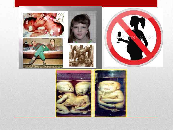• В подростковом возрасте алкоголь особенно опасен, так как в этом возрасте формируются клетки, необходимые для зачатия будущего ребёнка, как у юношей, так и у девушек. • Для развития будущего ребёнка опасно состояние опьянения и в момент зачатия. Сила повреждающих воздействий непредсказуема: от лёгких нарушений до тяжёлых поражений органов будущего ребёнка. • Употребление алкоголя в период беременности приводит к уродующему воздействию на плод. Алкоголь проникает от матери к ребёнку по кровеносным сосудам, что может привести к мертворождению. • Поражённые гены отца и матери – алкоголиков могут передаваться по наследству через несколько поколений. • Французские врачи пришли к выводу: чтобы произвести полноценное потомство, родители не должны пить в течение одного - двух лет. Алкоголь и беременность