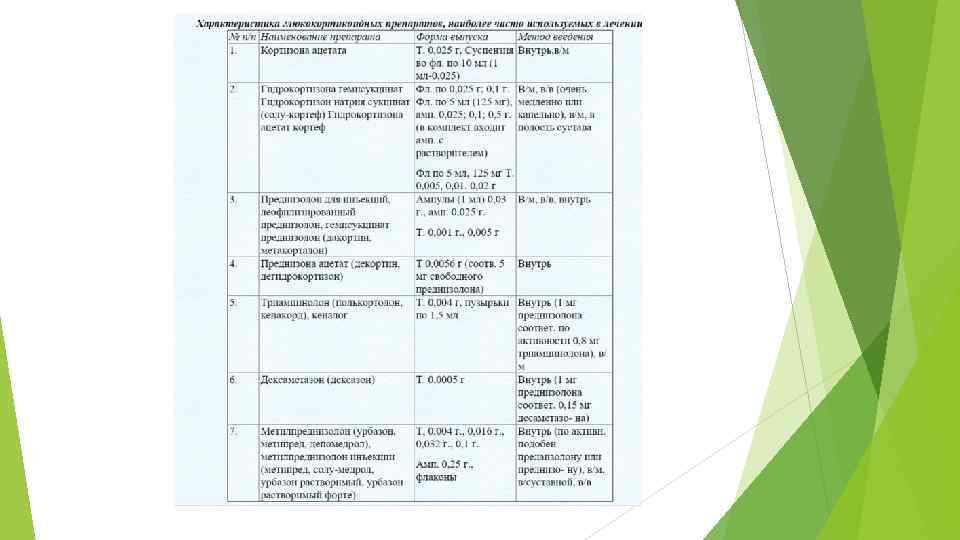 Фармакологическая терапия ГК интенсивной (кратковременной) лимитированной (в течение нескольких дней или месяцев) – это введение однократно или в течение 3 -4 дней высоких доз ГК. Она используется при острых воспалительных процессах с преобладанием экссудативного компонента (например, отек слизистой гортани). При этой терапии отмена назначения глюкокортикоидных препаратов производится резко (без постепенного снижения дозы). длительной (лечение на протяжении нескольких месяцев, лет и даже пожизненное) Этот вид терапии особенно часто сопровождается осложнениями (54 - 88 %). Если первоначальная доза достаточно велика (больше 30 мг/сут в расчете на преднизолон), то снижение гормонов производят из расчета по 5 -10 мг каждые 3 дня. В случаях первоначальной дозы средней величины (менее 30 мг преднизолона в сутки) - по 5 мг в 5 -7 дней, а начиная с дозы 15 мг в сутки - по 2. 5 мг каждые 3 дня.