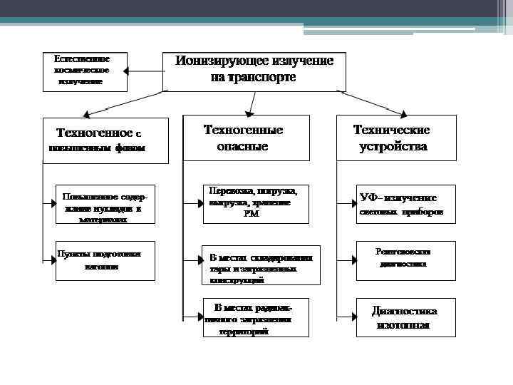 Источники ионизирующего излучения: Природные источники ионизирующего излучения: Спонтанный радиоактивный распад радионуклидов; Термоядерные реакции, например на Солнце; Индуцированные ядерные реакции в результате попадания в ядро высокоэнергетичных элементарных частиц или слияния ядер; Космические лучи. Искусственные источники ионизирующего излучения: Искусственные радионуклиды; Ядерные реакторы; Ускорители элементарных частиц (генерируют потоки заряженных частиц, а также тормозное фотонное излучение); Рентгеновский аппарат как разновидность ускорителей, генерирует тормозное рентгеновское излучение.