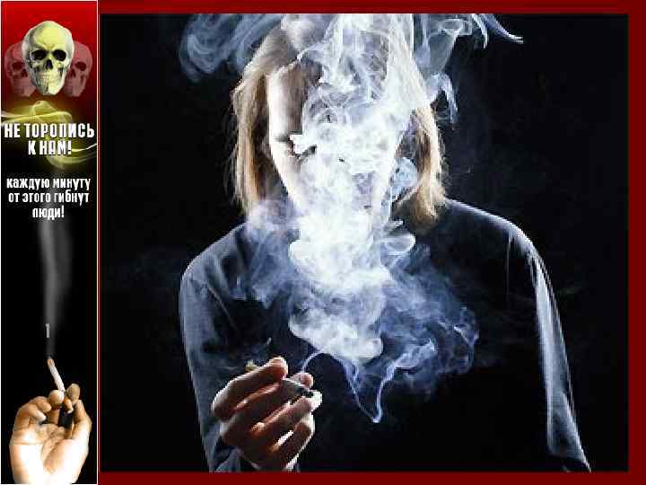 Состав горящей сигареты n 4000 соединений n 40 канцерогенных веществ n. Несколько сотен ядов n. Тяжелые металлы n. Радиоактивные вещества
