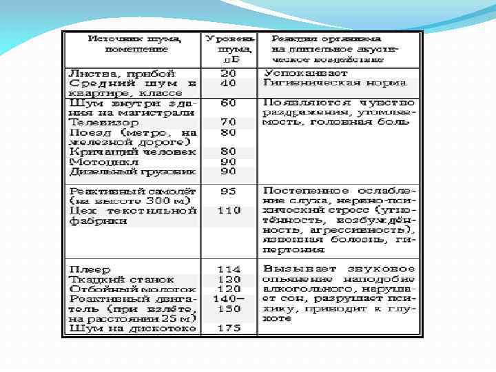 Примеры влияния различных шумов <= 102 децибела реактивный самолет большой дальности при посадке (1500 м от конца ВПП) <= 98 децибел реактивный самолет средней дальности на взлете (1500 м после подъема с ВПП) <= 107 децибел автомобильный гудок на расстоянии 7, 5 м <= 102 децибела поезд-экспресс при скорости 140 км/ч на расстоянии 25 м <= 91 децибел автобус на расстоянии 7, 5 м <= 86 децибел мотоцикл на расстоянии 7, 5 м