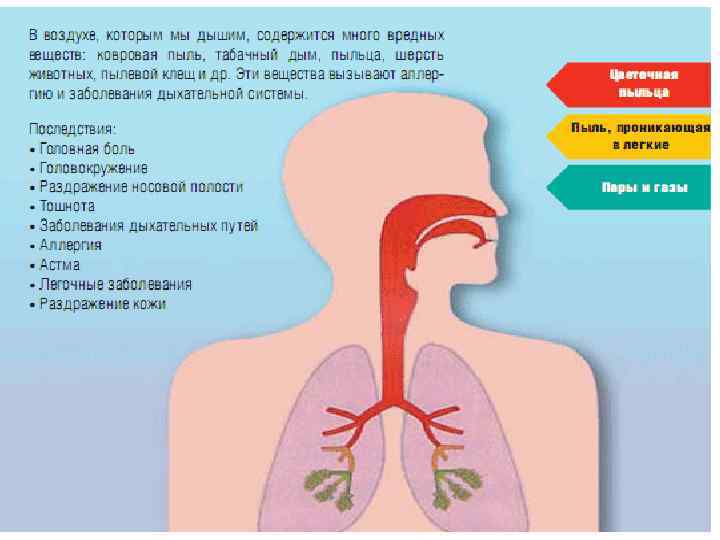 Все загрязняющие атмосферный воздух вещества в большей или меньшей степени оказывают отрицательное влияние на здоровье человека. Эти вещества попадают в организм человека преимущественно через систему дыхания. Органы дыхания страдают от загрязнения непосредственно, поскольку около 50% частиц примеси проникающих в легкие, осаждаются в них.