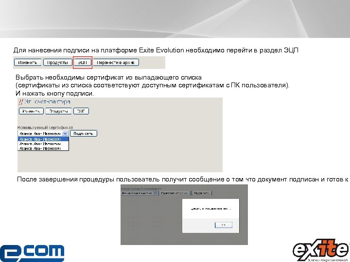 Для нанесения подписи на платформе Exite Evolution необходимо перейти в раздел ЭЦП Выбрать необходимы сертификат из выпадающего списка (сертификаты из списка соответствуют доступным сертификатам с ПК пользователя). И нажать кнопу подписи. После завершения процедуры пользователь получит сообщение о том что документ подписан и готов к