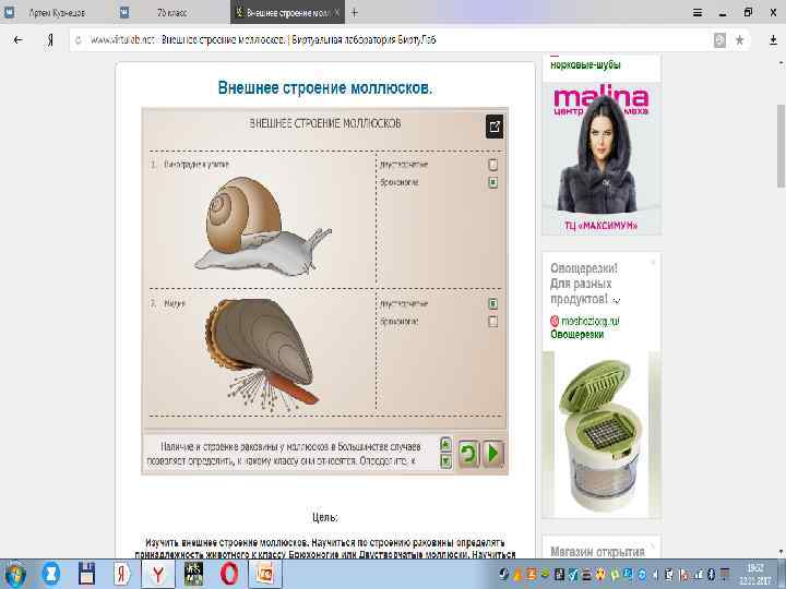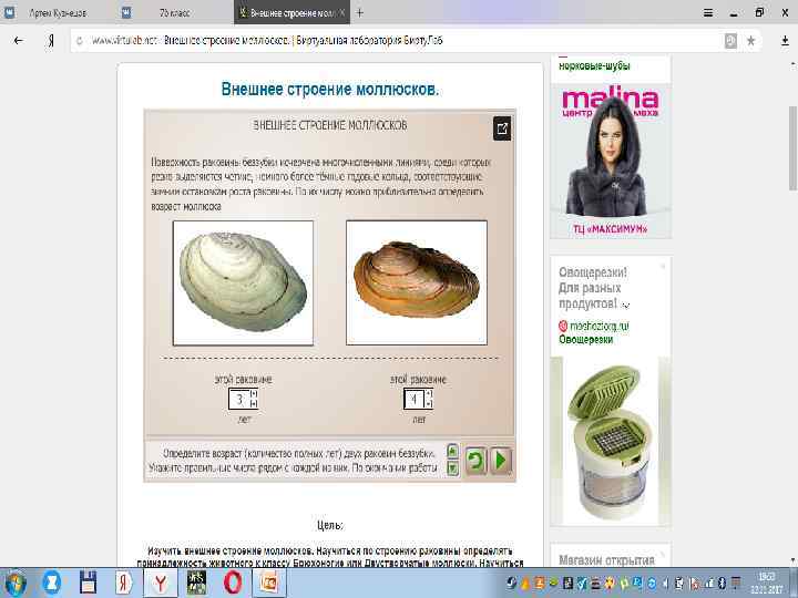 • Цель: • Изучить внешнее строение моллюсков. Научиться по строению раковины определять принадлежность животного к классу Брюхоногие или Двустворчатые моллюски. Научиться определять возраст двустворчатого моллюска по годовым кольцам на раковине. • Ход работы: • 1. Изучить внешнее строение виноградной улитки. Определить основные элементы её строения. • 2. Изучить внешнее строение мидии. Определить основные элементы её строения. • 3. На основании строения раковины изученных моллюсков определить, к каким классам типа Моллюски они относятся. • 4. Изучить строение раковин двух двустворчатых моллюсков. По числу годовых колец определить их возраст. • 5. Сделать вывод из проделанной работы.