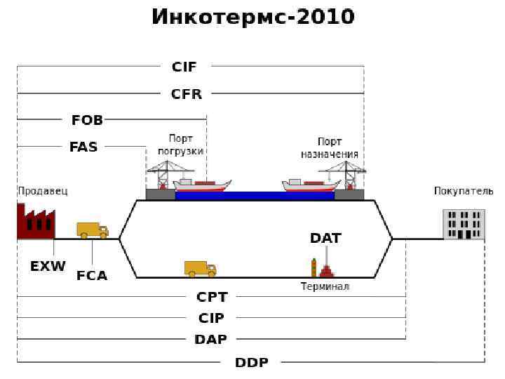 Группы терминов «ИНКОТЕРМС 2010» Группа E — отгрузка, переход обязательств — у места отправки. Продавец обязан предоставить товары покупателю непосредственно на предприятии-изготовителе, своём складе, таможенная очистка товара продавцом не производится; Продавец не отвечает за погрузку товара на транспортное средство; EXW. Группа F — основная перевозка не оплачена, переход обязательств у терминалов отправления для основной перевозки. Продавец обязуется поставить товар в распоряжение перевозчика, которого покупатель нанимает самостоятельно; FCA, FAS, FOB. Группа C — основная перевозка оплачена продавцом, переход обязательств — у терминалов прибытия для основной перевозки. Продавец обязан заключить договор перевозки товара, но без принятия на себя риска его случайной гибели или повреждения товара; CFR, CIF, CPT, CIP. Группа D — прибытие, переход обязательств у покупателя, полноценная доставка. Продавец несёт все расходы по доставке и принимает на себя все риски до момента доставки товара в страну назначения; DAT, DAP, DDP.
