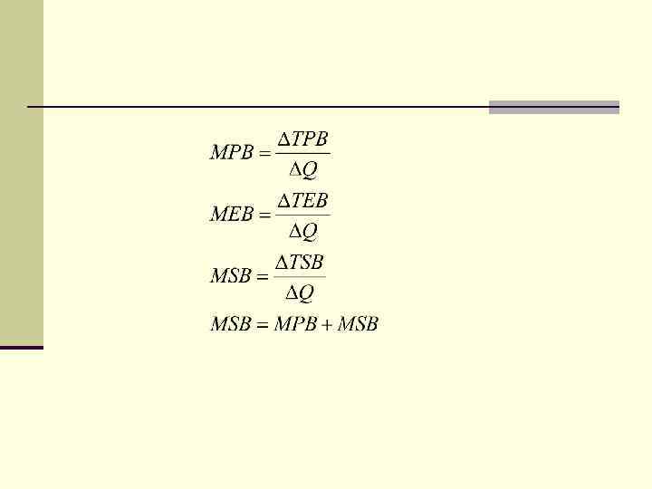 n Внутренняя выгода (РВ, private benefit) – выгода непосредственных потребителей данного блага, являющихся его покупателями n Внешняя выгода (EB, external benefit) – выгода всех третьих лиц, вызванная производством и потреблением данных благ n Общественная выгода (SB, social benefit). n SB=PB+EB