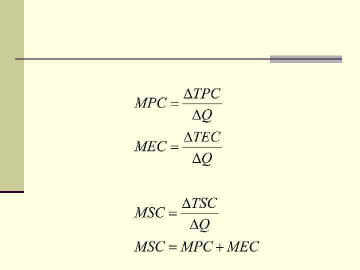 n Частные издержки (РС, private cost)– издержки фирм – производителей данного блага; n Внешние издержки (EC, external cost) издержки, связанные с выпуском продукции, не оплачиваемые производителями, а перекладываемые на третьих лиц; n Общественные издержки (SC, social cost) SC = PC + SC