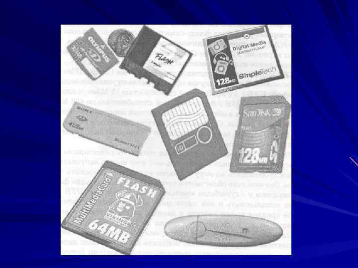 Твердотельные накопители Форматы карт флэш-памяти Форматы Multimedia Card (ММС) и Secure Digital (SD) постепенно уходят ввиду ограниченной емкости (до 64 Мбайт для ММС и 256 Мбайт для SD) и низкой скорости работы. Формат Smart. Media призван стать основным форматом для карт широкого применения (от банковских карточек и проездных в метро до удостоверений личности). – Это тонкие пластинки весом всего 2 грамма. Емкость – до 128 Мбайт, скорость передачи данных – до 600 Кбайт/с). Используются в сфере цифровой фотографии и носимых МРЗ-устройств.