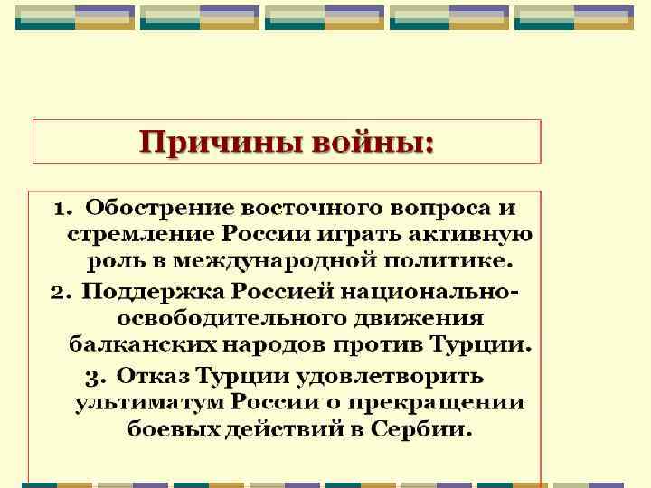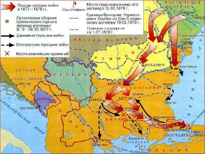 Летом 1875 г. начался Балканский кризис. Его причиной стало восстание в турецких провинциях Боснии и Герцеговине, в апреле 1876 года восстание началось в Болгарии, но они были подавлены турецкими властями. В июне 1876 года Сербия и Черногория объявляют войну Турции. Они так же были разгромлены. Командующим сербской армией стал генерал Черняев. На все призывы прекратить подавление восстаний Турция отвечала молчанием. Главнокомандующий русской армией великий князь Николай Николаевич. Переправа русской армии через Дунай у Зимницы 15 июня 1877 года
