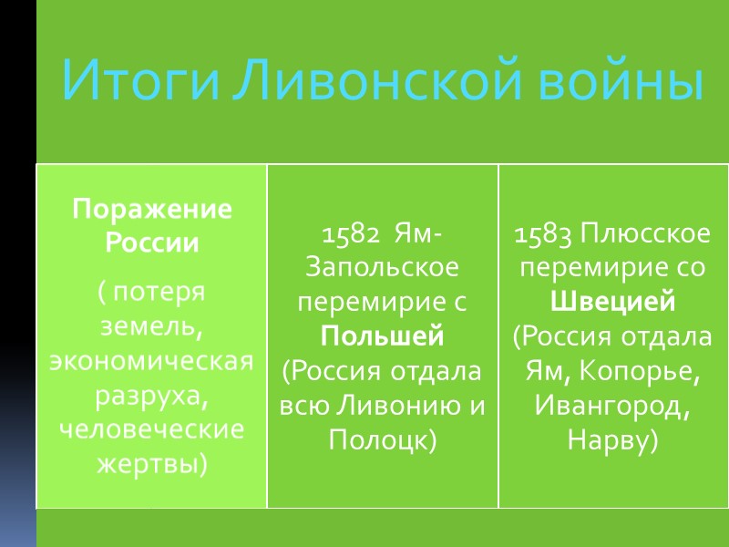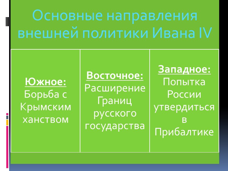 Внешняя политика Ивана IV (Грозного) Ливонская война (1558-1583) Скачать презентацию Внешняя политика Ивана IV (Грозного) Ливонская война (1558-1583) 32410-vneshnyaya_politika_ivana_iv.ppt Количество слайдов: 7 Внешняя политика Ивана IV (Грозного) Ливонская война (1558-1583) Борьба с Крымским Ханством Расширение границ русского государства Итоги внешней политики Ивана IV